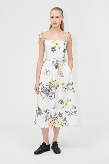 White midi dress with floral embroidery, scalloped edges, and cut-out details at the waist. Designed with adjustable tie straps and a concealed zipper at the back.