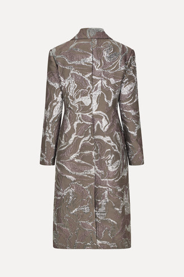 Structured mid-length coat with double breasted cut, thigh slits and abstract metallic pattern. Fully lined with STINE GOYA logo lining. Layer over your favourite look from the collection.