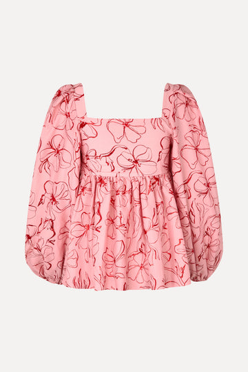 Square-cut neckline blouse featuring a Peplum silhouette, emphasizing a flared hem. It has long puffed sleeves with elasticated cuffs, adding volume to the arms. The fabric is a sheen pink Recycled Polyester blend, adorned with an all-over metallic red floral pattern.