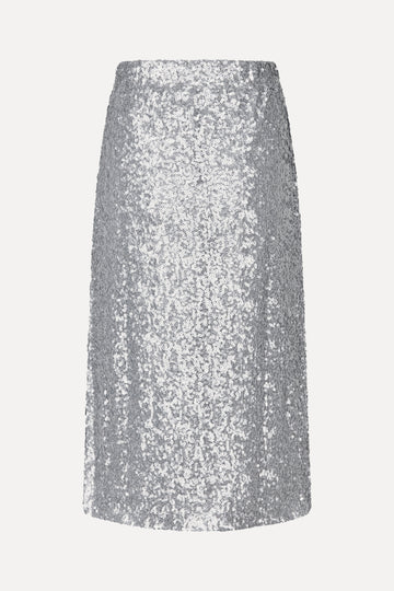 Relaxed mid-length skirt with a stretchy high waist, slip skirt layer and bright metallic sequined material. Pair with the Double Collar Shirt in Steel Grey and the 24H Studded Boots in Jet Black.
